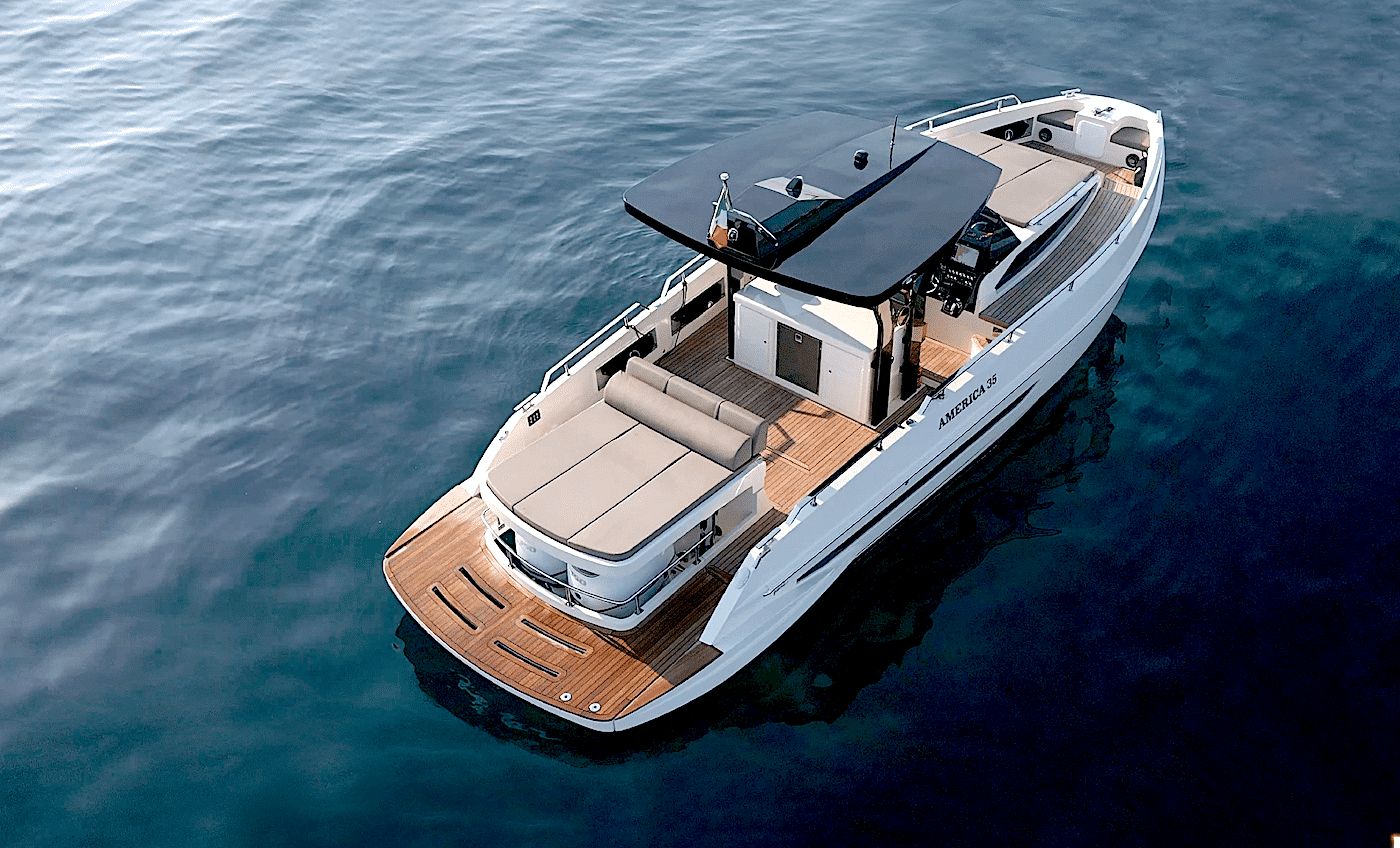 Abbiamo già discusso alcune delle sue caratteristiche in un articolo qualche mese fa, quando abbiamo incontrato il team durante il Salone Nautico Internazionale di Genova. I numerosi dettagli ben studiati di questo scafo mostrano immediatamente quanto lavoro sia stato dedicato al progetto: la cofanatura del motore che nasconde i fuoribordo, la piattaforma di poppa basculante e il ponte rialzato a tribordo che consente una maggiore altezza libera nel bagno sono solo alcune delle tante caratteristiche distintive dell’America 35.