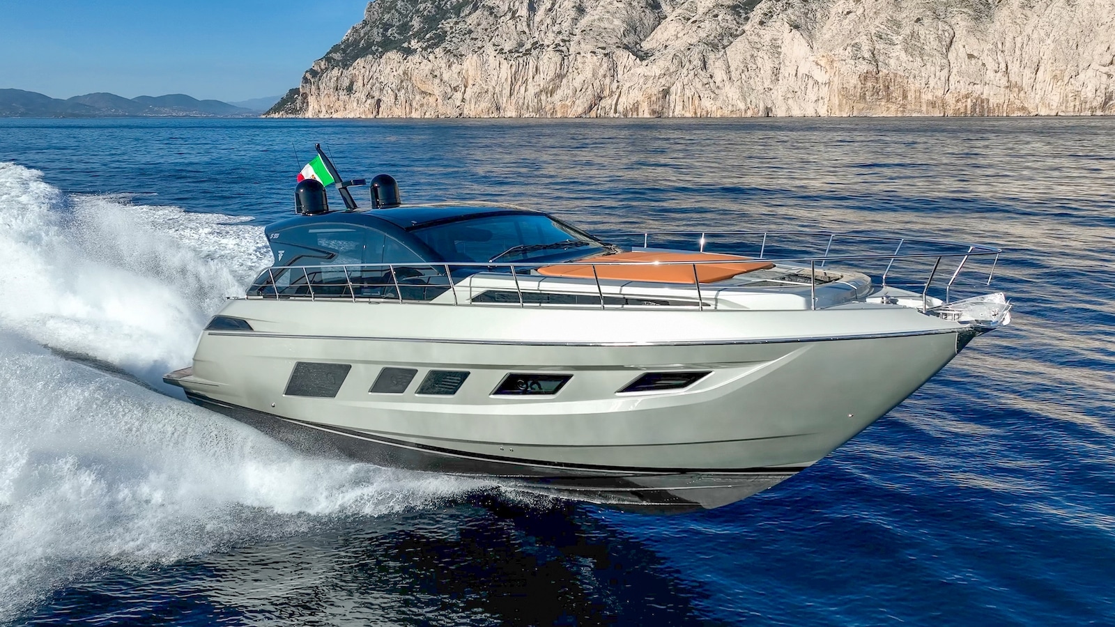 Ma è giunto il momento di vedere come va questo gioiello, spingiamo le manette verso il basso e la velocità aumenta rapidamente: 30, 40, 45 nodi, un paio di regolazioni fini e raggiungiamo i 47,7. Non male davvero per una barca di 17 metri che, in ordine di marcia, peserà almeno 25/26 tonnellate. Ciò che sorprende è la stabilità di questo yacht, c’è un’onda lunga residua eppure, nonostante la notevole velocità, stiamo navigando con un livello di comfort incredibile. La prua entra e esce dalle onde con assoluta fluidità, non sbatte mai.