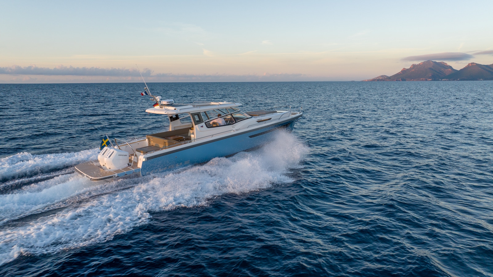 Prima di tutto, la straordinaria nuova plancetta di poppa ad azionamento idraulico, che “abbraccia” i due fuoribordo mercury, è stata davvero una speciale intuizione del cantiere scandinavo.