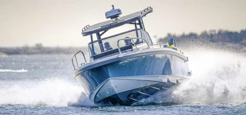 Usciamo per un test con il T9 X dal porto di Cannes, con un tempo magnifico e con molta onda lunga da sud-est. Al minimo, l’imbarcazione naviga a circa 3 nodi e 500 giri/min con un consumo di 4,7 litri/ora. Niclas mi lascia guidare e, giusto per sentire un po’ di adrenalina, spingo subito i motori al massimo, sentendo immediatamente tutta la loro potenza.
