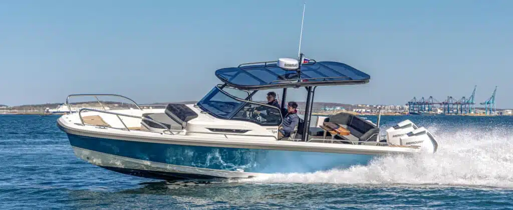 In questa versione, il T-Top offre una perfetta protezione dal sole grazie al materiale riflettente che lascia passare la luce creando al contempo un’utilissima barriera termica nelle giornate calde. Altrettanto interessante è la possibilità di chiudere l’intera dinette centrale grazie alle cerniere alle estremità dell’ampio T-Top, che si collegano al parabrezza e consentono anche l’utilizzo invernale di questa imbarcazione, che offre abilmente una protezione completa dal vento e dalle intemperie. La console di guida offre molto spazio, anche per persone più alte come Niclas Augustin, responsabile e tecnico del cantiere, che oggi testerà l’imbarcazione con noi.