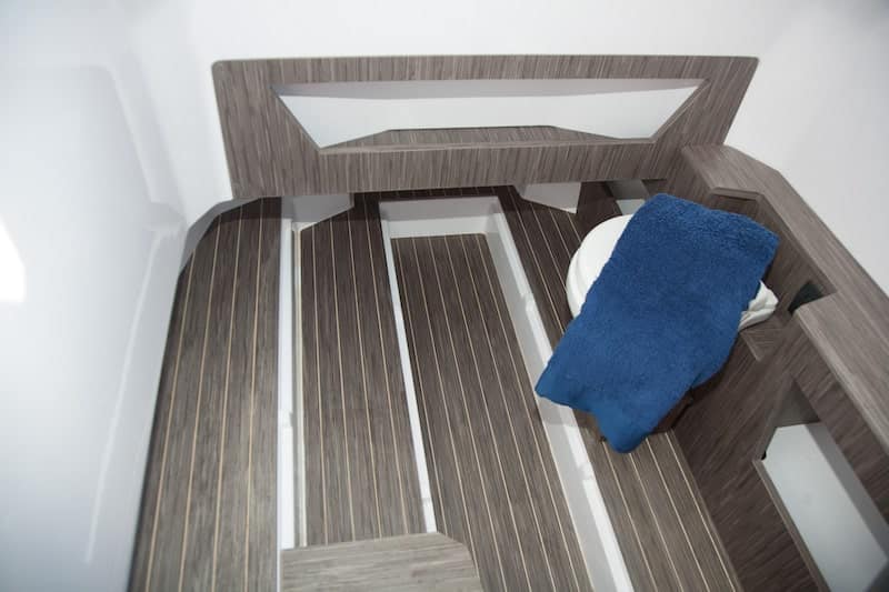 Ma è sottocoperta che troviamo un’altra sorpresa. Oltre a un piccolo spogliatoio e a un WC elettrico, questa zona può ospitare una cuccetta doppia per trascorrere una notte a bordo.