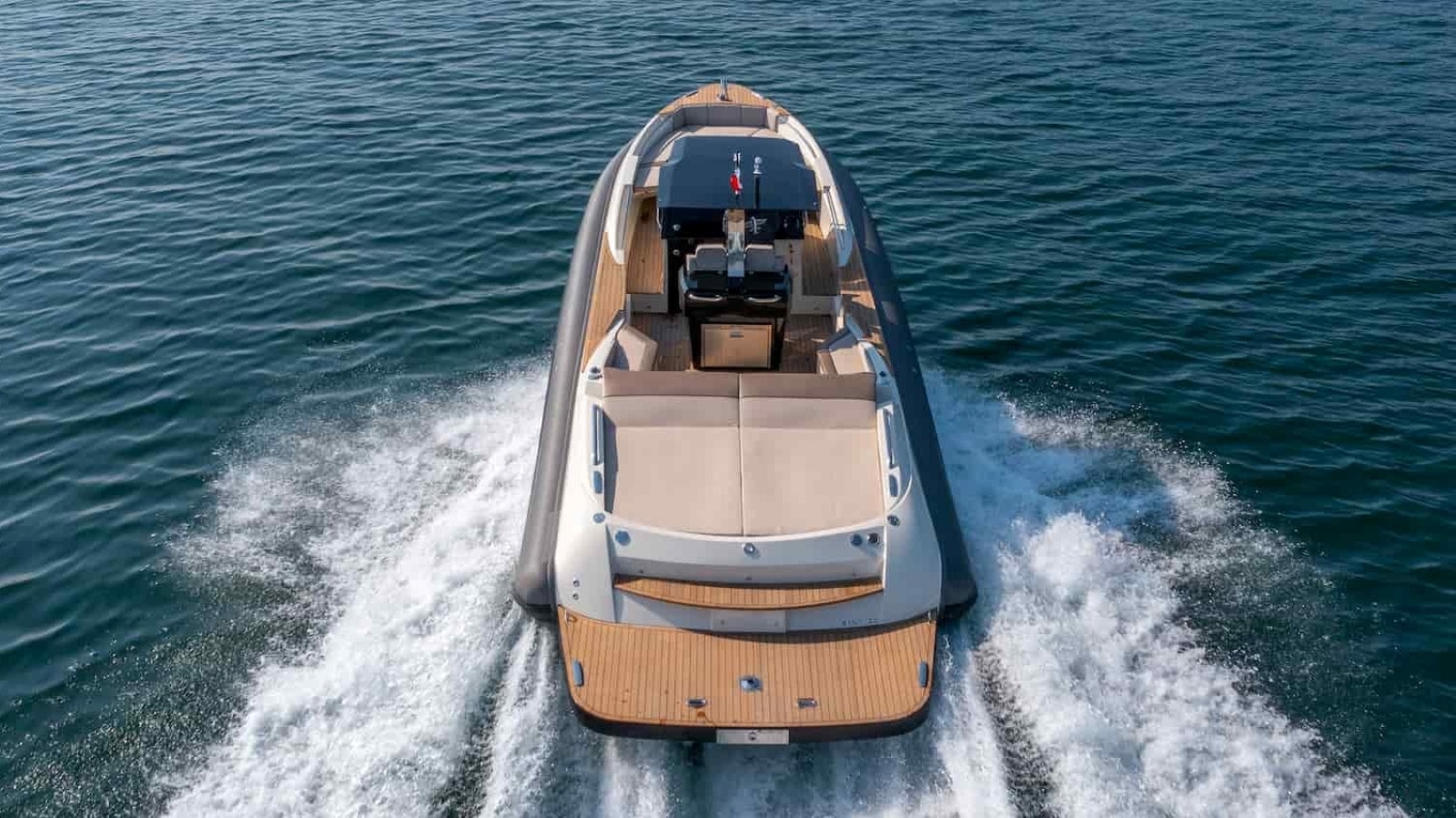 Appena saliamo a bordo dei due RIB, siamo lieti di scoprire che gli spazi sono davvero ben proporzionati: a bordo, l’impressione non è affatto quella di essere su una barca di 11 metri, poiché la parte centrale offre ampi camminamenti con un ampio uso del teak che incornicia l’intera lunghezza del ponte, consentendo un facile passaggio dalla piattaforma di poppa alla prua.