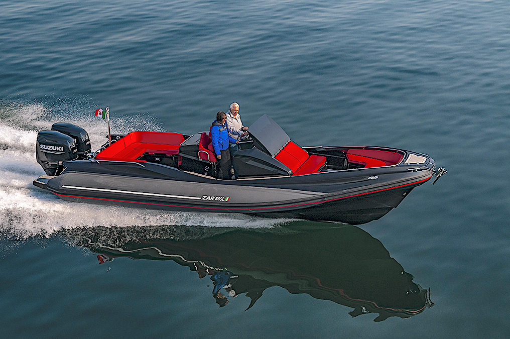 alimentato con un potente motore Suzuki DF 300. La nostra esperienza di test aveva evidenziato tutte le qualità dell’ammiraglia di Formenti e in realtà non avevamo bisogno di scoprire altro su questa barca. Ma il cantiere navale ha voluto stuzzicare la nostra curiosità e quella di tutti gli appassionati di Zar dotando l’85 piedi di un opzione motore mai vista prima e installando due straordinari fuoribordo Suzuki DF 250. Così, il nostro desiderio di testare nuovamente questa barca, prima al Salone Nautico Internazionale di Genova e poi sul Lago Maggiore, è diventato incontenibile. I risultati sono stati esaltanti, con una velocità massima di 54 nodi (l’anno scorso, abbiamo toccato “solo” 37,2 nodi).
