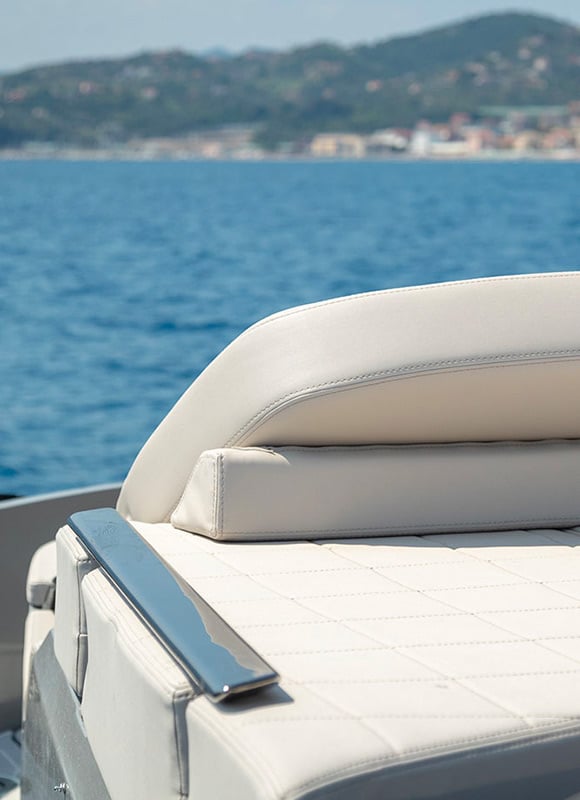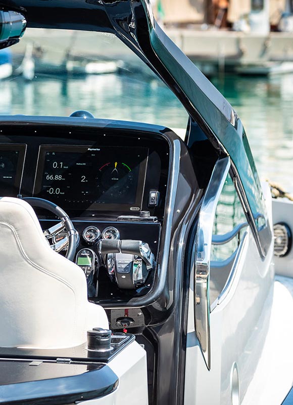 Quello che lo staff di Sacs Marine ci ha invitato a provare in una splendida giornata autunnale è la versione entrobordo. Pur favorendo gli spazi sul ponte – specialmente la zona della spiaggia grazie alla presenza di una piattaforma di poppa che può ospitare facilmente una moto d’acqua o un water toy – questa configurazione non sacrifica le prestazioni di una barca indissolubilmente orientata alle corse. Come vedrete più avanti, i due motori diesel Volvo D6, da 380 CV ciascuno, incastonati tra il mega prendisole di prua, non deluderanno il nostro desiderio di scompigliarci i capelli.