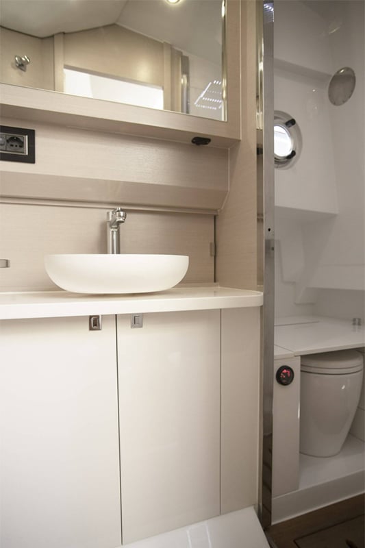 Un letto king-size domina la cabina armatoriale che, adiacente alla dinette, forma un unico open space. Ci sono anche un divano angolare nel corridoio e due cuccette nella cabina situata sotto il pozzetto, la cui altezza è sufficiente per trascorrere una notte in totale comfort.