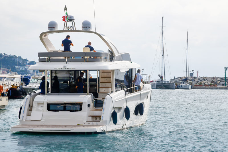 Osservando la scena, ci rendiamo subito conto che questa Navetta 48 è progettata per essere manovrata facilmente da un equipaggio familiare, il che è un elemento essenziale per una barca di queste dimensioni. Dalla postazione di pilotaggio sul flybridge, la visuale è a 360° e buona e, cosa molto importante, si vede perfettamente l’angolo di dritta della plancetta di poppa.