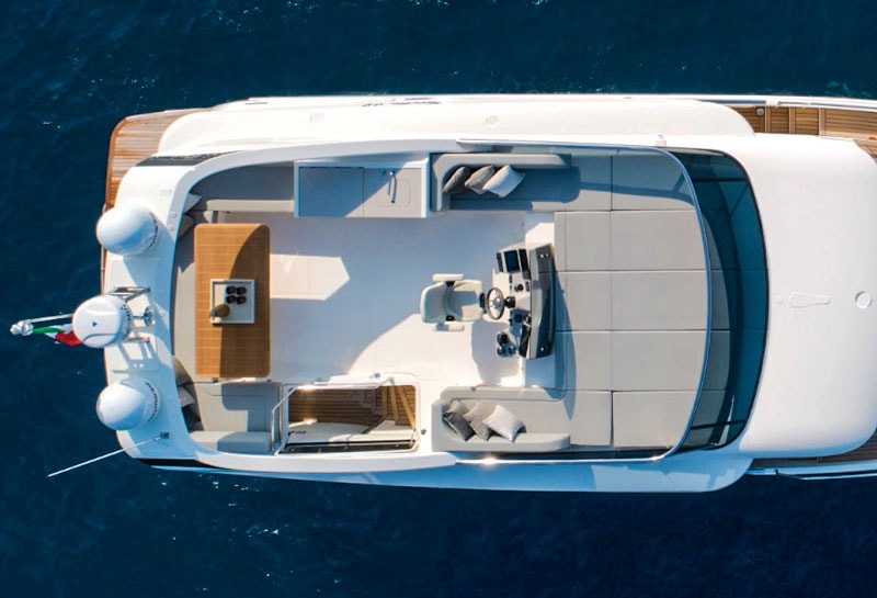 Torniamo nel pozzetto e saliamo sul flybridge dove l’ultima innovazione di Absolute diventa chiara. La postazione di pilotaggio centrale crea un’ampia superficie libera tutt’intorno. Grazie a un hard top rigido, quest’area diventa un vero e proprio spazio aggiuntivo che, dotato di sistemi di illuminazione, è sicuramente il luogo più bello dove cenare mentre la barca è ancora all’ancora.