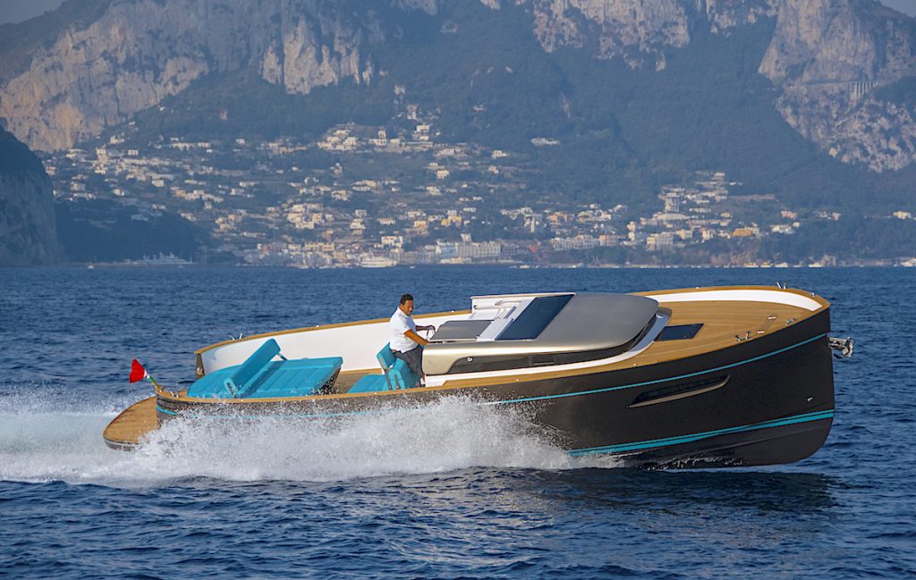 L’imbarcazione presentata la sera del 1° settembre a Capri a un pubblico composto da un ristretto gruppo di giornalisti nautici e da una folla di amici e potenziali clienti del cantiere italiano riprende infatti il tipico design esterno del classico gozzo, ora trasformato in un’estetica più moderna frutto di uno specifico processo evolutivo che la famiglia Aprea – nei suoi 170 anni di storia – ha voluto dare alla produzione di questa iconica imbarcazione.