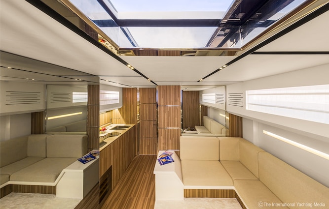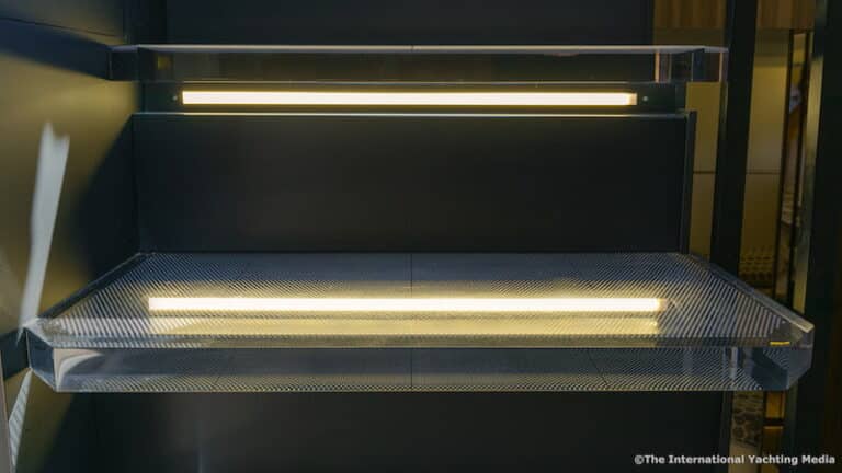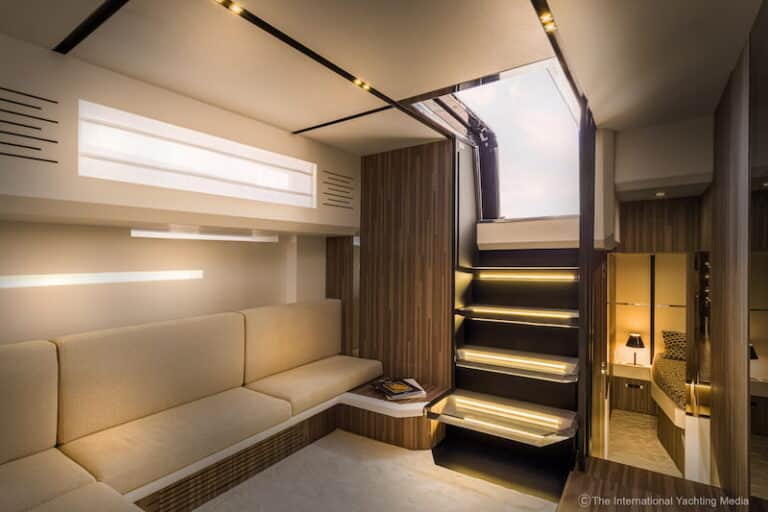 La scala che conduce dal tambuccio al ponte inferiore è composta da quattro gradini in plexiglas retroilluminati. Oltre alla dinette, c’è un’elegantissima cabina armatoriale a prua, due cabine doppie per gli ospiti a poppa e due bagni.