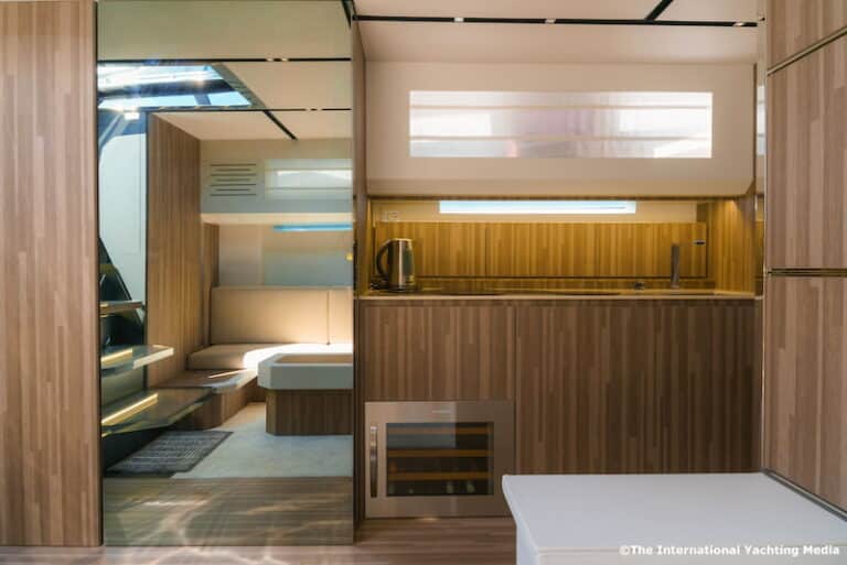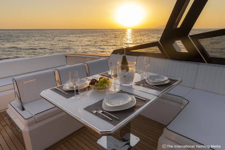Ciò che sorprende ancora di più, soprattutto considerando che siamo a bordo di un puro yacht open, è il silenzio che, anche navigando a oltre 30 nodi, mostra un eccellente isolamento della sala macchine combinato con una protezione ben studiata dal vento di velocità.