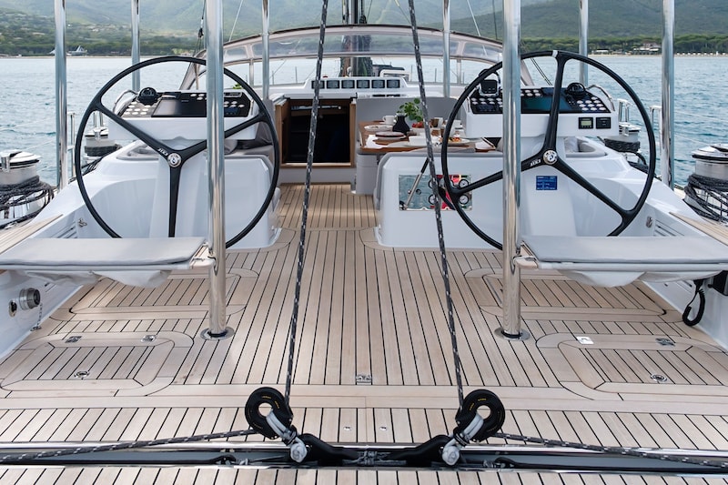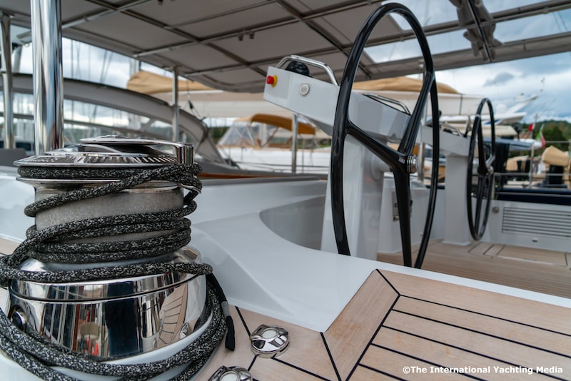 La barca è inclinata ma posso muovermi in totale sicurezza e abbastanza facilmente su e giù per l’enorme pozzetto e l’enorme superficie in teak che conduce a poppa. Sul ponte, la circolazione è facilitata da un incredibile numero di tientibene che si materializzano magicamente ogni volta che mi allungo alla fine di ogni singolo passo.