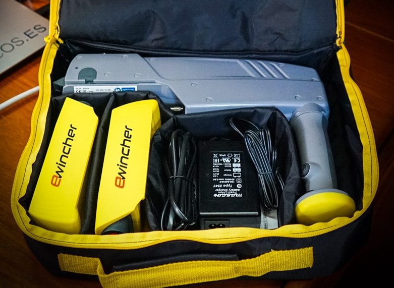 custodia ewincher Ewincher è progettato per rimanere a bordo e occupare poco spazio, come suggerito dalla sua custodia leggera, compatta e facile da trasportare. Aprendo la zip della custodia, abbiamo trovato il corpo della manovella, due batterie, un caricabatterie da 220 V e un manuale utente.