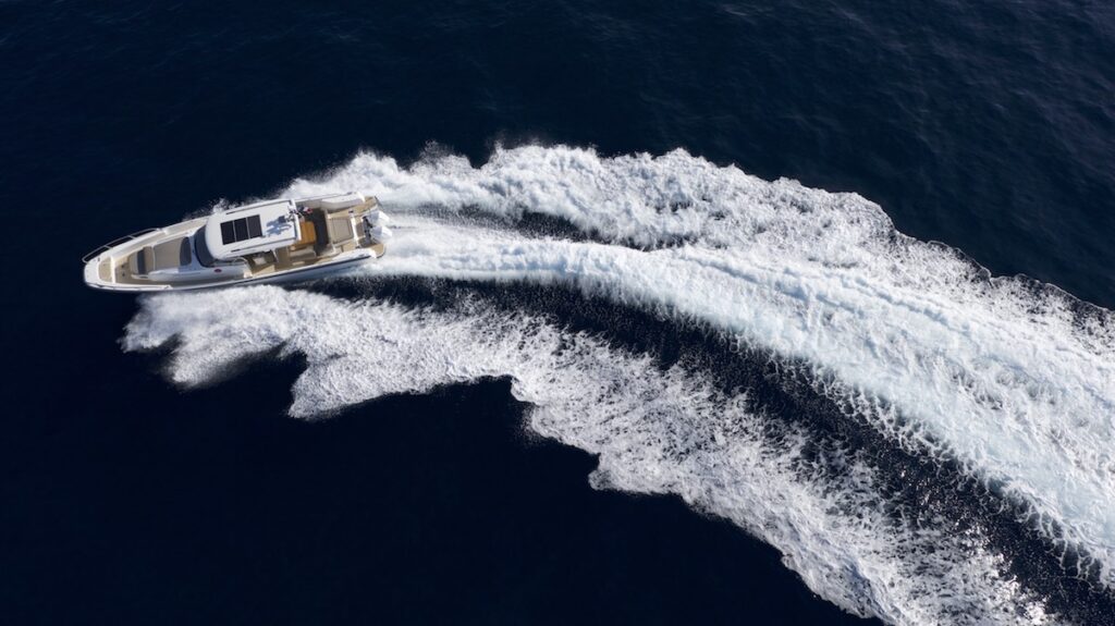 Lo scafo è a doppio step e scivola sull’acqua senza offrire alcuna resistenza rilevabile. Mentre do un’occhiata al plotter da 12 pollici, accelero fino a 9,4 nodi e sono lieto di notare che l’indicatore del Mercury Verado segna solo 1.500 giri/min. La posizione di guida è davvero confortevole, la visibilità a prua è totale e devo dire che il parabrezza protegge efficacemente dal vento che mi fischia nelle orecchie.