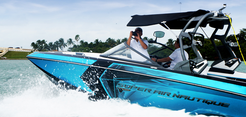 Dopo il nostro test, vogliamo verificarne l’efficienza in termini di “produzione di onde“. I tecnici di Miami Nautique International non hanno bisogno di un invito e accettano di mostrarci quanto facilmente questa barca passa alla modalità “wake board”. Usiamo le zavorre e la barca si immerge lentamente e raggiunge il punto che avevamo precedentemente selezionato tramite la console di guida.