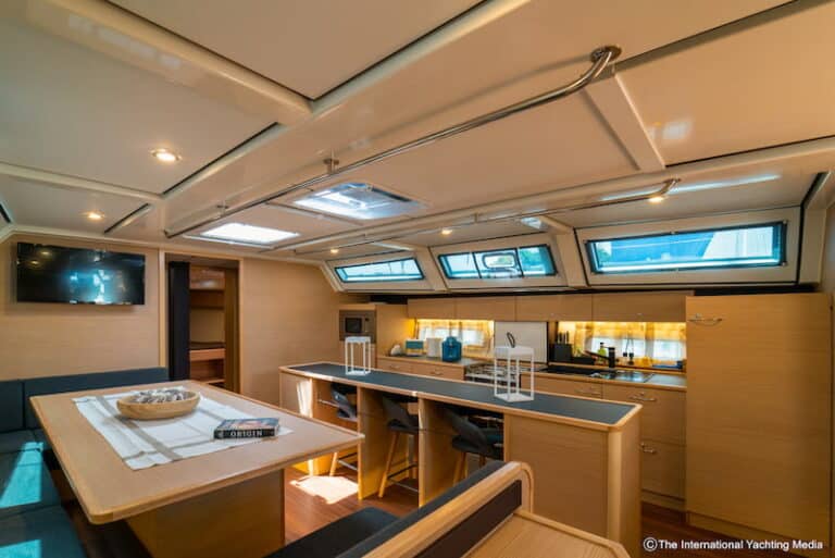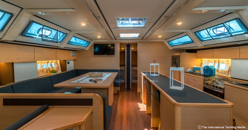 Sul lato di dritta, un’enorme cucina lineare offre un incredibile spazio di stivaggio ed è in grado di ospitare tutti gli elettrodomestici che si possono immaginare. Dietro la cucina, una penisola rettilinea ospita tre sedie aggiuntive, una cantina vini refrigerata e ulteriore spazio di stivaggio. Questo elemento d’arredo definisce anche il corridoio centrale che conduce da poppa a prua, rendendolo sicuro in qualsiasi condizione di mare.