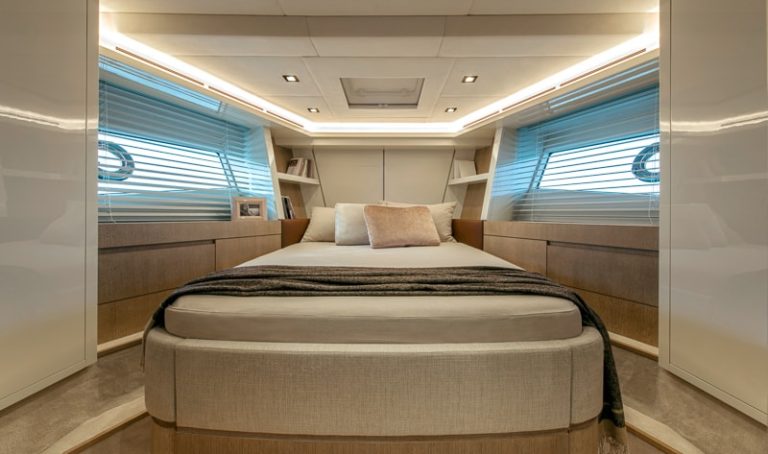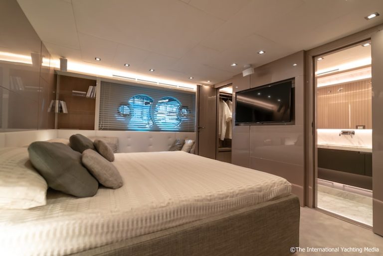 La cabina armatoriale è enorme e utilizza tutti i 5,5 metri di larghezza disponibili per offrire un ambiente lussuoso e raffinato i cui confini sono virtualmente estesi da due grandi finestre che, a forma di oblò adiacenti, sono diventate il motivo distintivo degli yacht Monte Carlo.