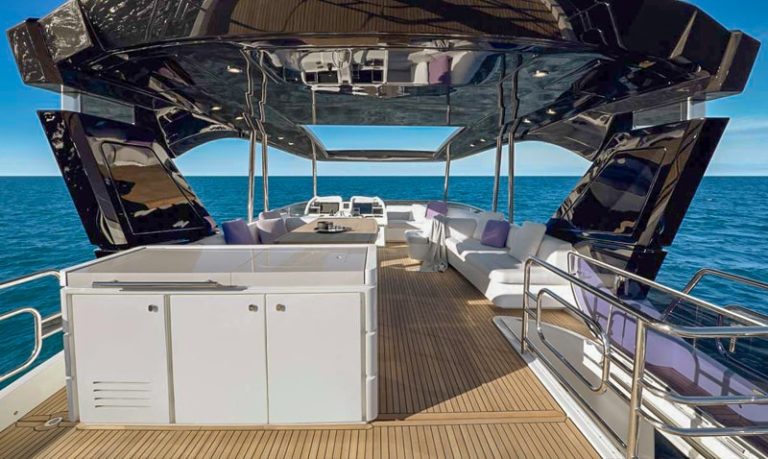 Protetto da un elegante T-Top in carbonio, conferisce allo yacht un ulteriore ed enorme salone all’aperto con una vista a 360 gradi che, quando necessario, può essere ulteriormente ampliata aprendo il tetto scorrevole elettrico.