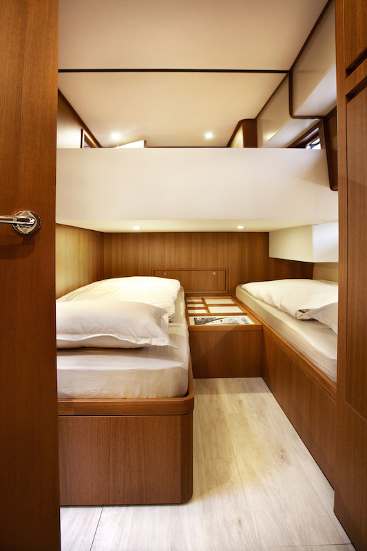 Contest 52MC FlybridgeMarcel mi lascia prendere il timone, Contest 52MC, VIP CabinTiro giù le manette e faccio navigare lo yacht a circa 23-24 nodi; poi, eseguo una virata decisa mentre il Contest 52MC restringe l’angolo di virata senza mai scomporsi. Poco dopo, trovo le (significative) onde della nostra scia e le attraverso senza rallentare e… e lo yacht non se ne accorge, alza e abbassa la prua come se avessimo attraversato un’onda di 10 cm.