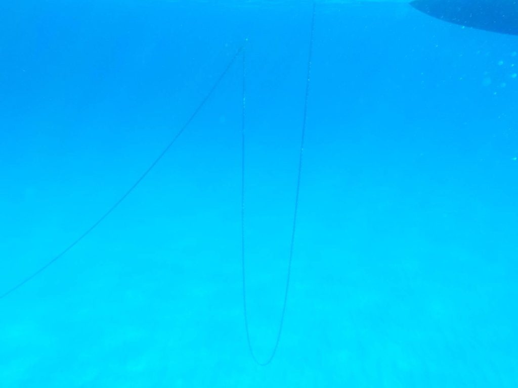 Se facessimo un ancoraggio tradizionale, avremmo calato una catena 3-5 volte più lunga della profondità, nel nostro caso 20 metri. Una catena da 10 mm pesa circa 2 kg. Quindi, per ogni metro lineare, considerando un Delta da 20 kg, abbiamo una linea di ancoraggio complessiva di 60 kg che è inferiore a 21 metri di lunghezza.
