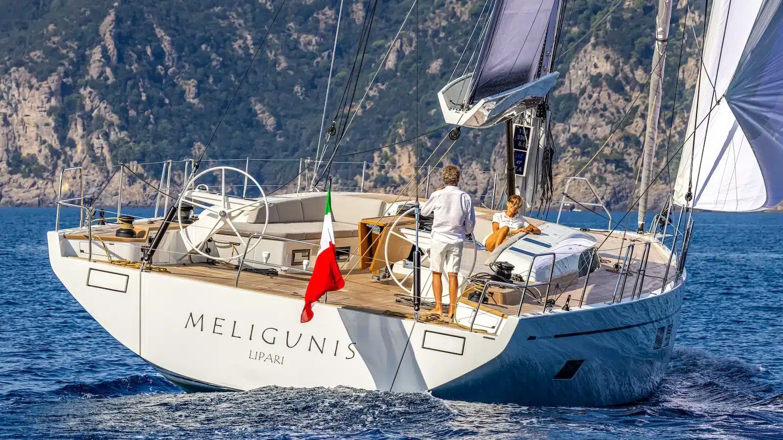 A poppa, troviamo la zona dedicata alla navigazione dove, dalle due colonne delle due ruote, tutte le manovre possono essere gestite elettricamente. Una configurazione ideale per navigare con un equipaggio ridotto e per una crociera confortevole, soprattutto considerando la posizione di tutti i winch che sono facilmente accessibili da qui.