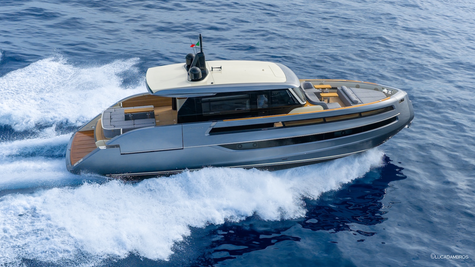 Back in port, the Invictus ST550 reveals its true superyacht soul, even though we’re talking about a boat of “only” 17 meters. The large aft dinette, with its U-shaped sofa and central table, is an open invitation to conviviality. Shaded by awnings supported by carbon poles, it turns into a genuine floating lounge—both elegant and practical. Adding to the wow effect are the drop-down side terraces, which expand the living space and give the feeling of being aboard a much larger yacht.